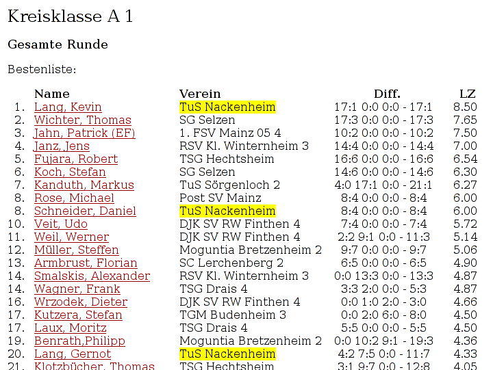 Tischtennis: Tabelle Kreisklasse A1